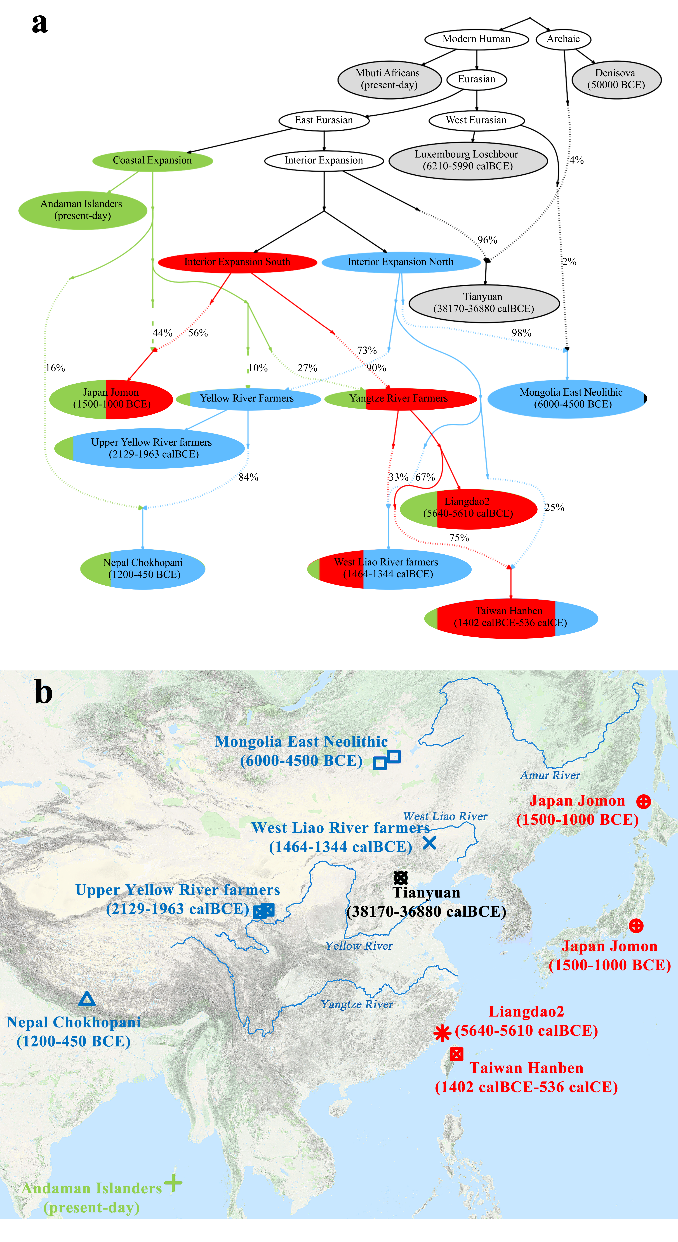研究人员利用古DNA数据检验了东亚地区农业和语言共扩散理论,发现了汉藏同源:5000年前黄河流域的农业人群在中国北方传播农耕、汉藏语言和相关技术,在遗传上成为了藏族和汉族的共同祖先人群之一;南岛与壮侗同源:3000-2000年前台湾地区的古人与大陆壮侗语人群有紧密的遗传关系,南岛语人群形成过程中还受到来自北方农业人群的基因混合影响,南岛和壮侗的祖先人群向南扩张,传播南岛语和壮侗语,并对南亚语人群有遗传贡献;自蒙古高原、贝加尔湖到黑龙江流域的广大地区的8000多年前的采集狩猎人群与其后的蒙古和通古斯语人群有着较强的遗传连续性,在遗传上并未明显受到来自农业人群的影响,反驳了语言学家Martine Robbeets提出的西辽河农业人群的扩张促成了原始泛欧亚语(Transeurasian)传播的假说。