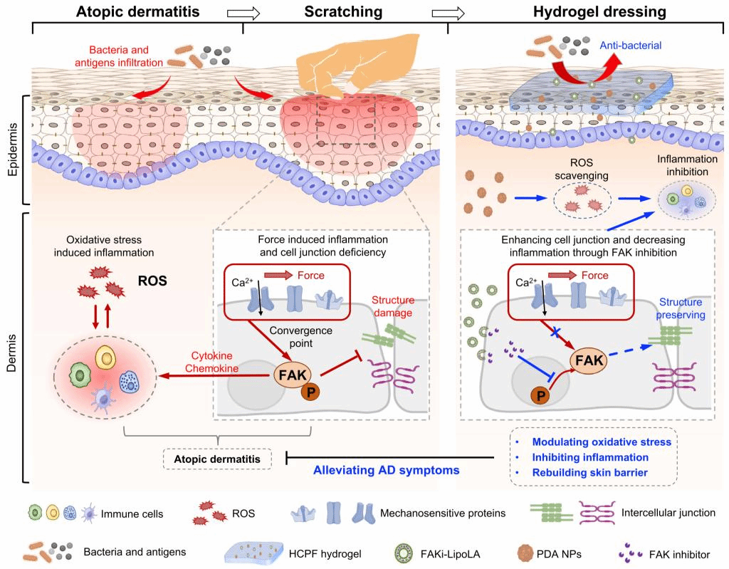 特应性皮炎(Atopic dermatitis, AD)是一种慢性炎症性皮肤病,通常伴有严重的瘙痒。患者由于瘙痒而产生的不由自主的搔抓是AD皮肤炎症加重和持续的重要原因。一方面,搔抓产生的力学刺激会促进皮肤细胞分泌TSLP等炎症因子,这会增强AD的炎症,形成“痒挠循环”;另一方面,搔抓产生的力学刺激会直接破坏皮肤屏障,从而增强细菌及过敏原在皮肤组织中的浸润,进而加重炎症。此外,AD中急性炎症导致的氧化应激和力学搔抓的作用是高度耦合的:剧烈抓挠可增强氧化应激并导致急性炎症,而氧化应激介导的炎症可引起细胞对力学刺激的敏化,从而增强搔抓下细胞的炎症反应。现有的AD治疗途径侧重于使用类固醇药物和抗组胺药减轻氧化应激与急性炎症,而针对搔抓的治疗往往被忽视,力-化协同治疗AD的效果同样不清楚。