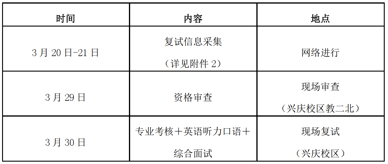 所有参加复试的考生均须按照学院通知在报到时进行复试资格审查。由学院指定专人按照上级有关要求及学校招生章程对考生身份、学历信息、报考条件(含学院在简章和目录中设定的要求),报考专项及享受照顾(含加分)政策的资格等进行全面审核,确定考生的复试资格。复试资格审查不合格者不得参加复试。