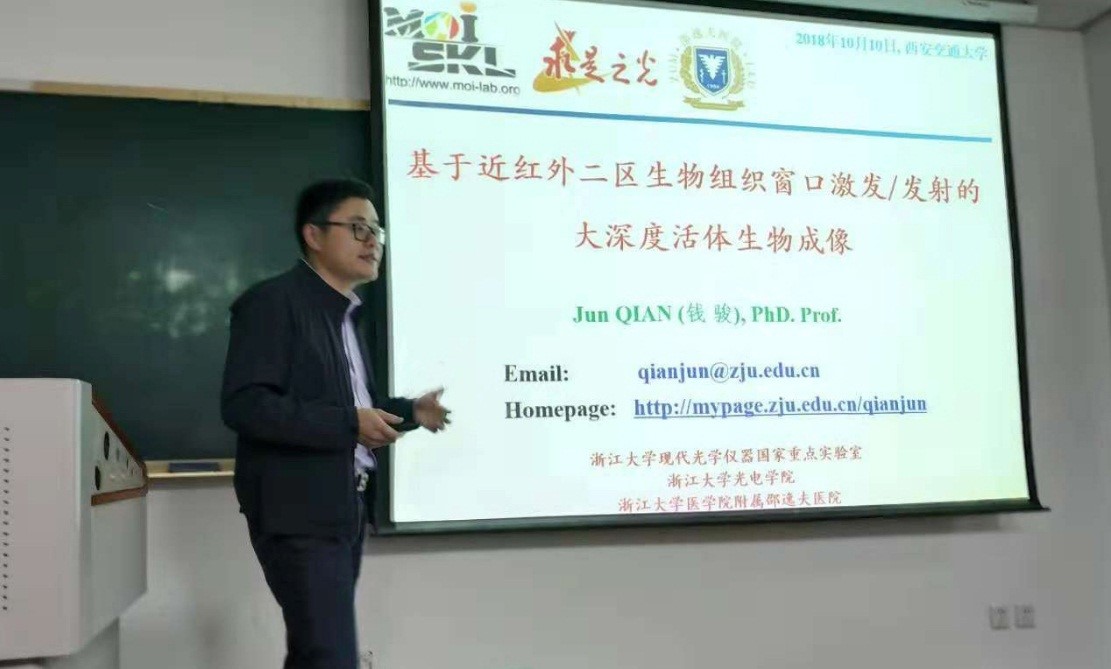 应生命学院张镇西教授邀请,10月10日,浙江大学光电科学与工程学院钱骏教授来访生命学院,并作了题为“基于近红外二区生物组织窗口激发/发射的大深度活体生物成像”的学术报告。