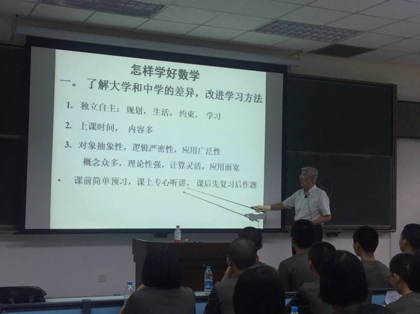 白色的衬衣,笔挺的黑西裤,马知恩老教授精神矍铄,步履稳健。八十多岁的老人显现出的却是春秋鼎盛之年的精气神。他戏称自己是八零后,平添了几分幽默之气。讲座还未开讲,同学们就已经感受到了马老教授的人格魅力和他手中数学的趣味。