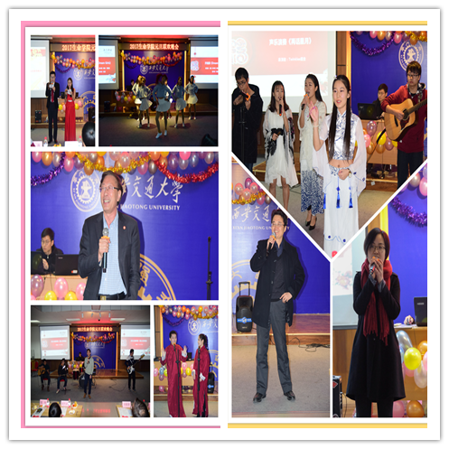 歌曲联唱《卡农的夏天》、《爱之初体验》、《我要你》、《亲爱的》、《广岛之恋》等轮番登场,或活泼动感,或浪漫温馨,或轻快悠扬,风格各异,变幻多姿。由同学们自编自导的小品《甄嬛传》、相声《梦想青年》等节目用惟妙惟肖的表演、别出心裁的服装和令人捧腹的角色反串,引得观众爆笑连连。热舞《After Hours》用动感的舞步彰显了同学们丰富多彩的校园生活和活泼阳光的青春风采。诗朗诵豪迈奔放、意境深远;吉他和二胡的合奏,现代与古典的碰撞,均赢得阵阵掌声。更有神秘嘉宾田中民老师现场演绎温情歌曲《母亲》,深情的演唱打动全场观众。节目中间穿插的抽奖环节以及师生共同合作的小游戏环节,把气氛推向一个又一个高潮。在《相亲相爱一家人》合唱中,联欢会圆满落幕。