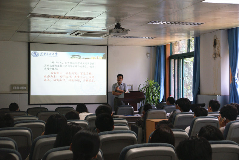 陆卫明教授从新加坡践行“五大”共同价值观的经验入手,强调文化价值观对国家发展的重要作用。随后,陆教授从中国特色社会主义核心价值观的战略地位、构建准则、精神元素以及培养途径四个方面对习近平总书记提出的核心价值观进行了精彩解读,其中重点阐述了社会主义核心价值观中包含的中国传统文化元素。陆教授将马克思列宁主义、毛泽东思想、中国传统文化等内容有效地融汇贯通在报告当中,并结合社会现实情况,分析了将中国特色社会主义核心价值观落到实处的措施。