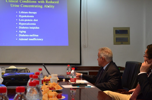 在接下来的这三场报告中, Jeff教授首先做了肾脏尿素运输调控及其对于多尿症(NDI)治疗的报告。因其主编经历,在第二个报告中Jeff教授详细讲述了SCI论文审稿流程及注意事项,为同学们后续发表文章提出了指导性的建议。蔡晖博士在报告中主要讲述了WNK1和WNK4两种激酶对于钾离子通道的调节作用。田中民教授对其实验室开展的盐敏感高血压的肾脏代谢机制进行了详细的介绍,并和两位专家就课题设计,数据分析以及研究结果进行了深入的讨论。Jeff教授和蔡晖博士对我们的研究工作给予一些建设性的指导意见。在和Jeff教授的讨论中同学们受益颇多,从科学精神,科研设计到论文写作都受到了很大的启发。