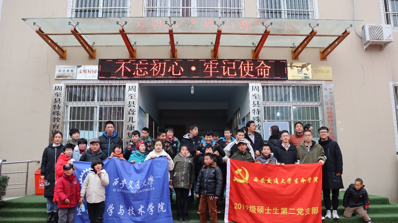 12月下旬,2019级硕士生第二党支部“小小红心向着党”社会实践团队在全院进行了广泛的线上线下宣传,号召全院师生为特殊孩童募集文具、书包、书籍等爱心物品。1月2日团队带着募集的爱心物品,乘车前往西安市周至县特殊教育学校。