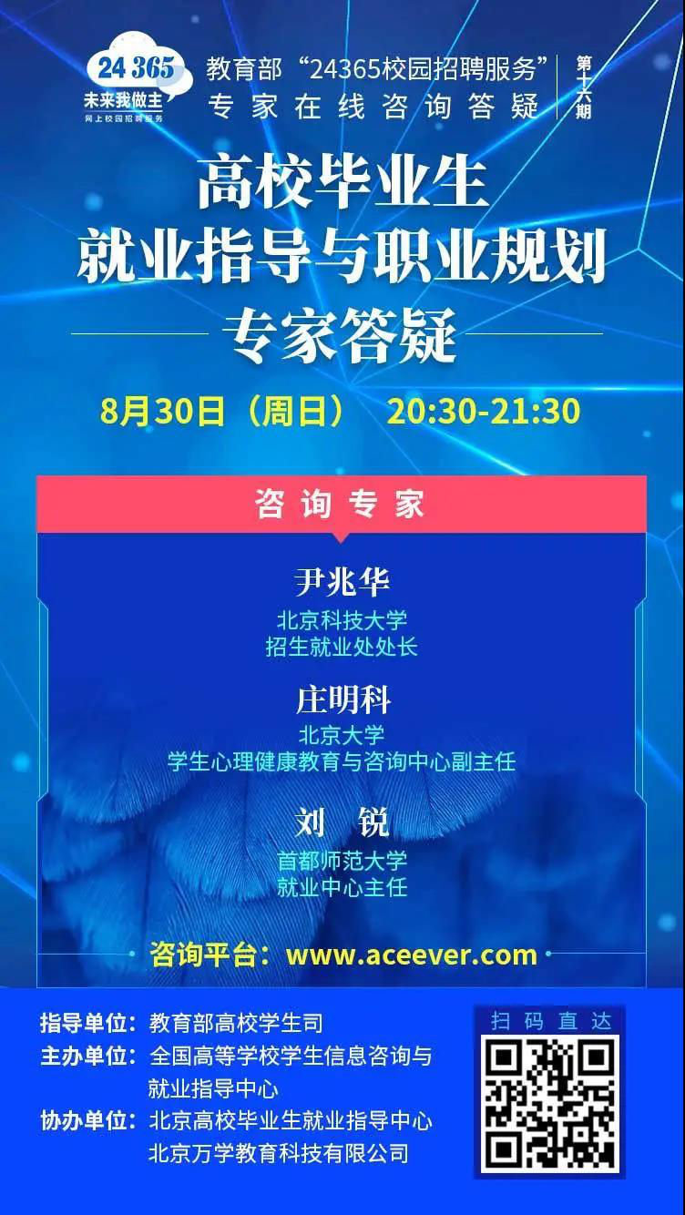教育部互联网+就业公益课程(第21期)8月30日(周日)19:00-20:00播出,教育部高校学生司副司长吴爱华同志作主题报告,重点介绍2021届高校毕业生就业工作的思路和举措,课程结束后举办专场答疑活动。