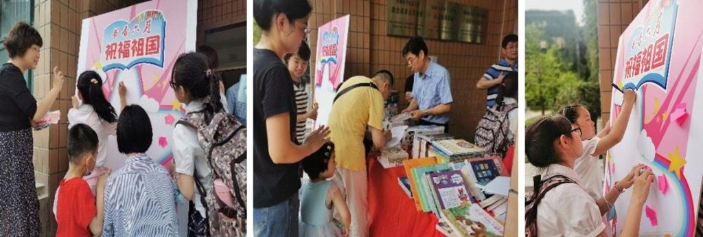 活动现场,学院精心准备了近百本图书,孩子们选好自己感兴趣的书籍,家长和孩子们“亲子共读一本书”并相互分享。参加活动的孩子用自己稚嫩的小手在纸上写下了对祖国、对亲人、对自己的祝福,很快展板上就贴满了孩子们纯真的祝福,孩子们的心中种下了爱国和感恩的种子。
