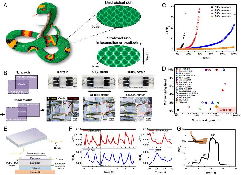 图1仿生叠覆鳞片结构广域应变传感器。(A)蛇皮表面交错重叠的鳞片;(B)叠覆鳞片结构PEDOT:PSS变形机理;(C)叠覆鳞片结构PEDOT:PSS用于应变传感:(D)所开发叠覆鳞片结构PEDOT:PSS在广域传感中的优势;(E)传感器结构;(F)所开发传感器用于可穿戴脉搏监测(小应变);(G)所开发传感器用于可穿戴肢体运动监测(大应变)。