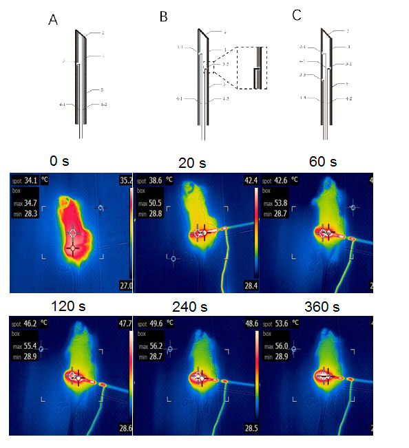 西安交通大学吴道澄教授等针对肿瘤热/热动力控温要求,在多物理场仿真结果的指导下,利用微纳加工技术如激光刻蚀等,研发了一系列热动力治疗专门用微电热针,经过优化设计了一种单回路微电加热针,利用激光技术在中空针体壁打孔将导线引出形成回路(图1上)。该微电热针可在0.2-2 V的低电压下实现动物体内1分钟快速升温、发热位置可调整、能实现长时间精确发热控温,特别适用于肿瘤热疗/热动力治疗。动物实验表明在施加电压为0.24 V时,60 s内小鼠肿瘤部位温度从34.7 ℃升高至53.8 ℃,加热20 s肿瘤温度就达到50 ℃,加热2 min温度达到稳态,肿瘤最大温度约56 ℃(图1下),该微电热针已经获得国家专利授权(ZL202010490961.0)。