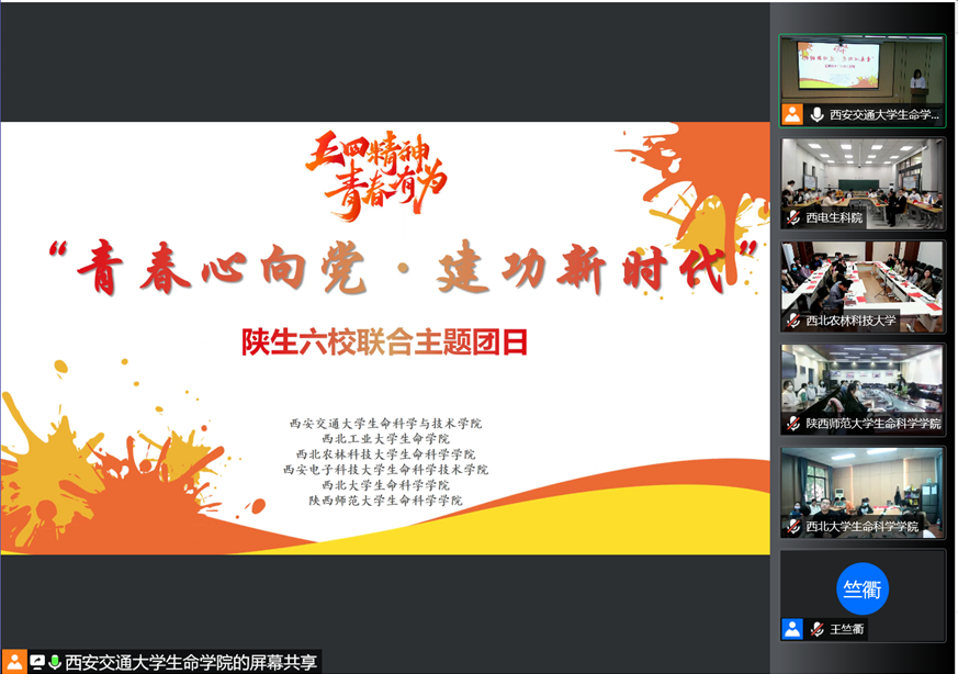 4月29日,西安交通大学生命学院联合西北农林科技大学生命学院、西北工业大学生命学院、西安电子科技大学生命学院、西北大学生命学院、陕西师范大学生命学院共同开展“青春心向党,建功新时代”主题团日。六校生命学院学生工作教师代表、团支部书记、团员参加,西安交通大学生命学院团工委副书记田宇欣主持。