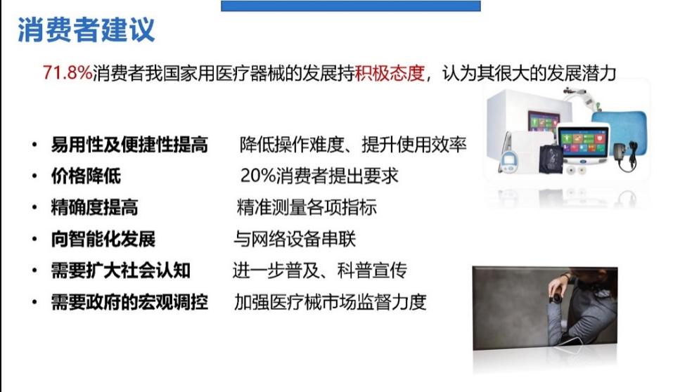 受调者对我国家用医疗器械的发展持积极态度,认为其很大的发展潜力。受调者也对家用医疗器械提出了提高易用性及便捷性、降低操作难度、提升使用效率、向智能化发展等建议。
