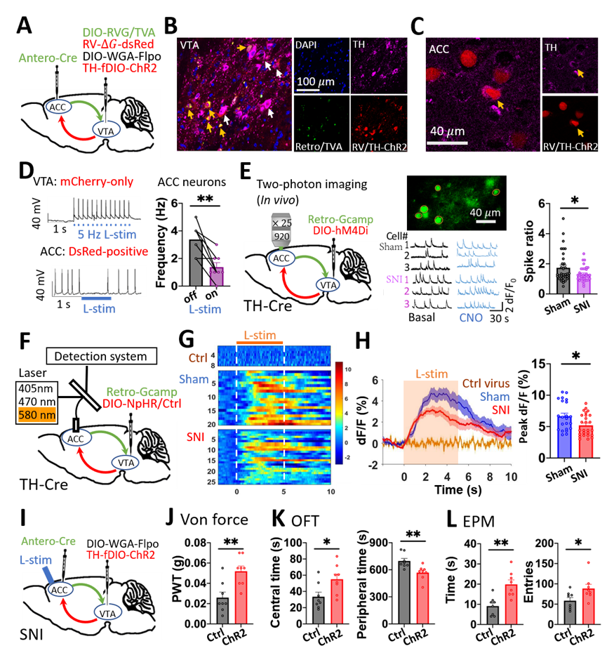研究团队进一步发现,VTADA神经元还可直接反向投射至ACCGlu神经元,介导负性情绪对慢性痛的反馈调节。团队推测,这群接收VTADA投射的ACCGlu神经元可能就是投射到VTA区域最初的ACCGlu神经元,从而在结构上形成一个封闭的神经环路。为了论证这一大胆的猜想,团队通过多重示踪病毒标记-光遗传偶联的电生理记录实验,证明在ACC和VTA脑区之间的确形成了ACCGlu-VTAGABA-VTADA-ACCGlu闭环的结构与功能连接(图3A-D)。进一步,团队利用清醒动物双光子在体钙成像(图3E)与自由行为动物在体光纤记录(图3F-H)在活体动物层面证明,化学抑制VTADA神经元向ACC的投射末梢的确可兴奋投射到VTA的ACCGlu神经元,且这种兴奋效应在SNI鼠中显著降低。更进一步,在行为调控层面,光遗传激活接受ACCGlu调控的VTADA神经元向ACC的投射末梢,可有效缓解SNI模型小鼠的痛敏异常及其诱发的负性情绪(图3I-L)。这些结果表明,痛觉信息处理中枢ACC与情感中枢VTA之间的确存在完整的ACCGlu-VTAGABA-VTADA-ACCGlu正反馈神经闭环,而这一闭环则是介导慢性痛与负性情绪之间相互促进的关键机制。