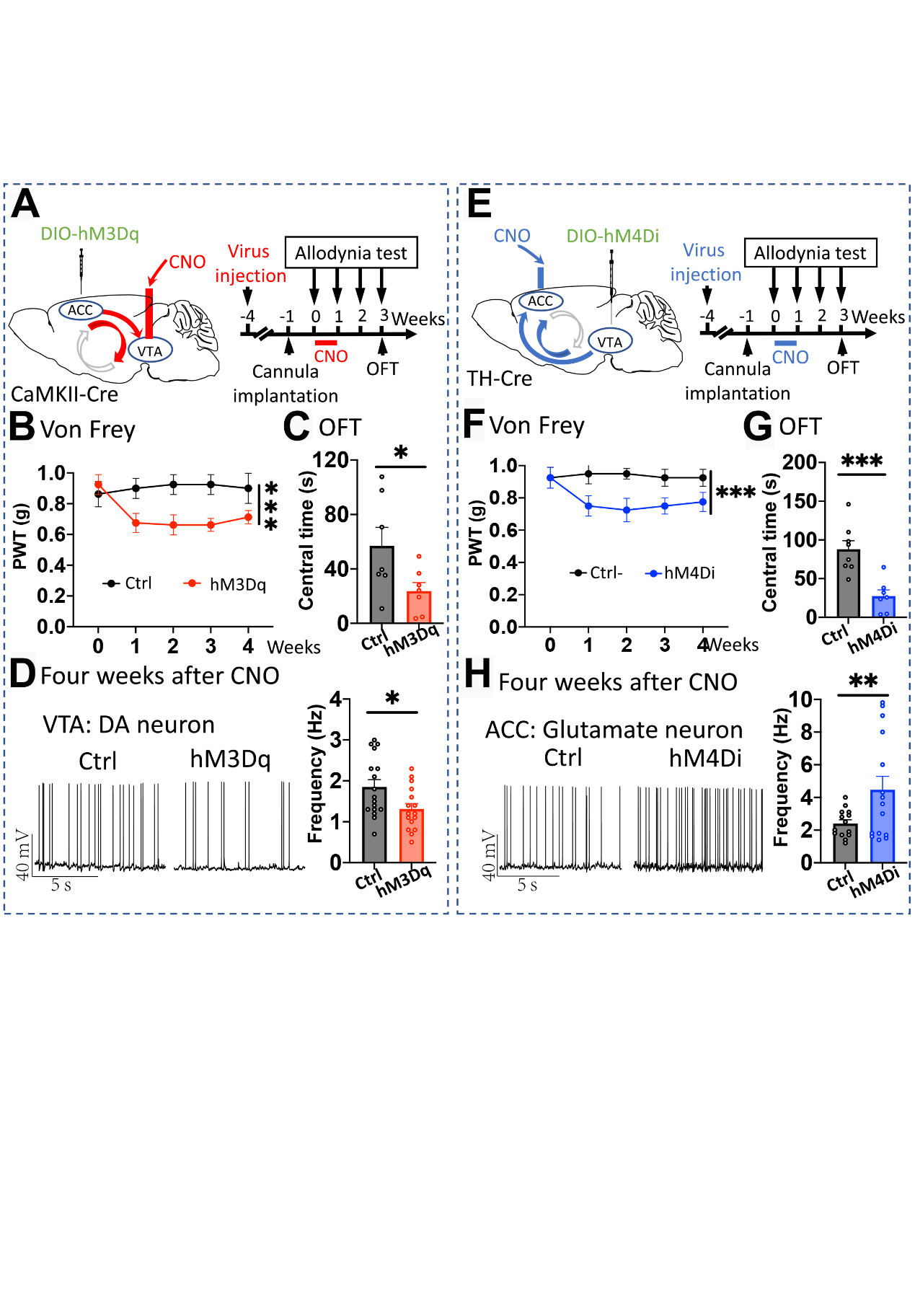 为进一步验证ACC-VTA-ACC正反馈闭环在慢性痛渐进性进展与长期维持中的调控作用,团队利用化学遗传学方法持续激活ACCGlu神经元向VTA的投射或抑制VTADA神经元向ACC的投射,发现两种方式均可激活ACC-VTA-ACC正反馈闭环,不仅导致ACCGlu神经元和VTADA神经元兴奋性水平的长期改变,还可导致小鼠发生痛觉增敏和焦虑样症状,且这种病理性改变可长期持续(图4)。因此,ACC-VTA-ACC正反馈闭环不仅是痛觉与情绪互作的核心机制,还是慢性痛渐进性进展与长期维持的重要中枢机制。