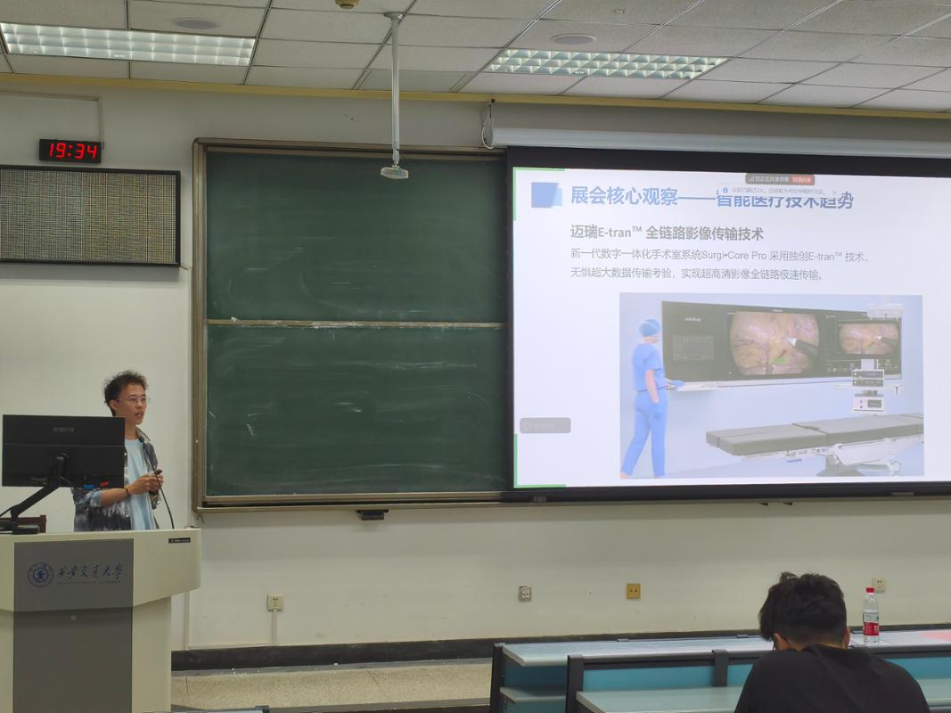 研究生专场则呈现出更深入的技术分析和产业思考。袁润同学在《国产医疗器械的崛起之路》中,以迈瑞全光纤体征监测仪、联影光子计数CT等突破性产品为例,揭示了国产器械从“跟跑”到“领跑”的艰辛历程,并指出核心部件自主化与AI安全性评估等关键挑战。黄治隆同学围绕《医疗影像的自主创新路径》,分析了全球市场格局,展示了联影“元智”大模型的影像诊断应用及东软双宽体CT、迈瑞无液氦磁共振等硬件创新,强调“产学研医”协同对转化至关重要。王博韬同学描绘了《脑机接口的产业化图景》,对比侵入式与非侵入式技术,分享了脑虎科技临床进展与强脑科技消费产品,展望“脑机接口+AI”在神经疾病治疗中的巨大潜力。霍平平同学以《智能驱动与交叉赋能》为题,聚焦联影AI导航CT、迈瑞全链路影像传输等技术,表示智能化与精准化是行业核心引擎,作为青年学子要立足临床痛点推动创新。