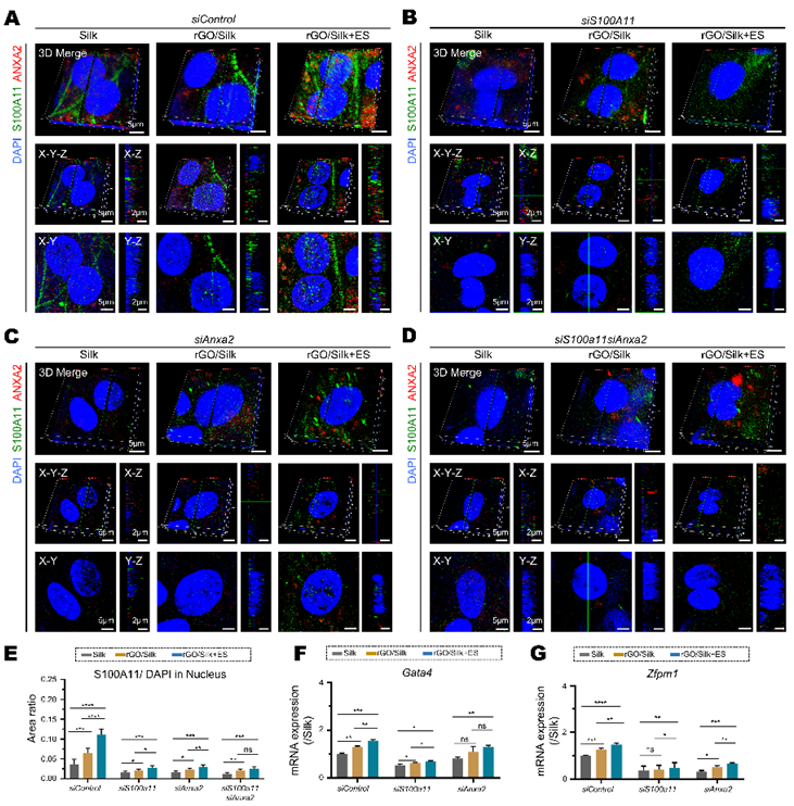 值得注意的是,研究团队还发现S100A11的表达并不局限于细胞质,其在细胞核中的表达受到电学微环境的调控。通过三维共聚焦显微分析发现,在Silk中,细胞核内S100A11表达极低;而在rGO/Silk组,尤其是rGO/Silk+ES组中,S100A11核内表达明显增强。敲低S100a11或Anxa2基因均显著抑制了S100A11的核转位,表明该过程依赖于S100A11/ANXA2复合体的形成。ANXA2本身定位于细胞质且不入核,提示其可能在S100A11穿越核膜过程中起辅助作用。进一步研究表明,在rGO/Silk和rGO/Silk+ES条件下,Gata4和Zfpm1的mRNA水平显著上调;而沉默S100a11或Anxa2则下调其表达,且电刺激只可部分恢复。这些结果提示,电信号诱导使得S100A11在ANXA2协助下核转位,从而上调Gata4和Zfpm1转录,可能会进一步促进心肌结构与功能相关基因的表达(图5)。