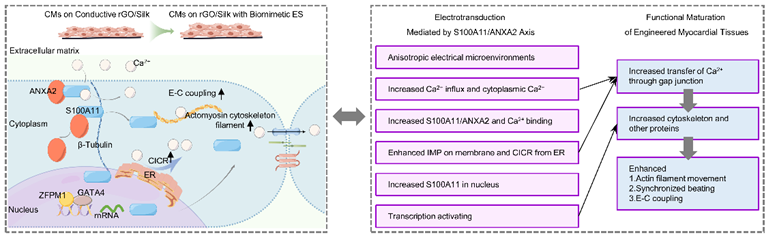 综上所述,本研究综合运用材料学、组织工程学、分子生物学与生物信息学等多学科手段,首次揭示了S100A11/ANXA2介导的信号通路将外源电信号向细胞功能转化过程中的核心作用(图6)。该复合体不仅是电信号与钙信号、细胞骨架之间的关键桥梁,还可通过S100A11的核转位参与基因调控,进而实现从“电”到“结构”再到“功能”的多层级转化。外源电学信号既是触发因子,也是结构与功能重塑的驱动力,而S100A11/ANXA2复合体则是实现这一转化的核心执行者。该机制不仅揭示了电学微环境对心肌细胞的作用路径,也表明电学微环境与分子信号网络之间存在复杂的双向耦合关系,填补了心肌组织工程领域中电学微环境调控ECT功能成熟的分子机制方面的空白,为心脏修复和再生医学提供了新的思路,S100A11/ANXA2复合体介导的信号通路有望成为促进ECT功能成熟、增强移植组织与宿主心肌电学耦合和同步收缩、药物研发与基因治疗的新靶点。该电学与分子转导耦合的模式,有望扩展至神经、肌肉和骨组织工程等领域,具有广泛的跨学科应用前景。