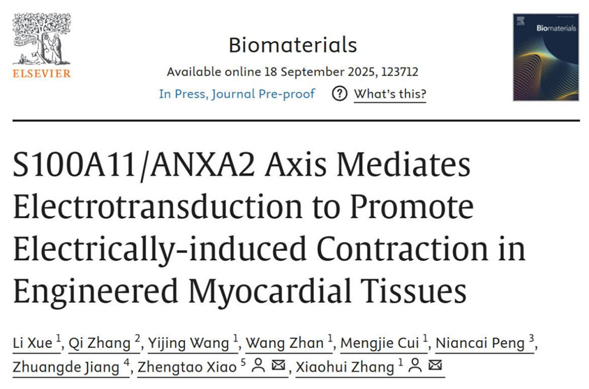 近期,西安交通大学生命学院张晓慧教授团队首次系统阐明了体外电学微环境在促进ECT功能成熟中的作用机制,提出外源电信号可通过S100A11/ANXA2复合体有效转导进入细胞,并通过调控电诱导的钙内流、瞬时膜电位(IMP)及钙诱导钙释放(CICR)发挥关键作用,从而促进肌节排列和细胞骨架成熟;同时,S100A11通过核转位激活转录因子表达,强化细胞的兴奋–收缩耦联(E−C coupling),显著增强ECT细胞的同步搏动能力。相关内容以“S100A11/ANXA2轴介导电转导以促进工程化心肌组织中的电诱导收缩”(S100A11/ANXA2 Axis Mediates Electrotransduction to Promote Electrically−induced Contraction in Engineered Myocardial Tissues)为题,在国际权威期刊《生物材料》(Biomaterials)上发表。