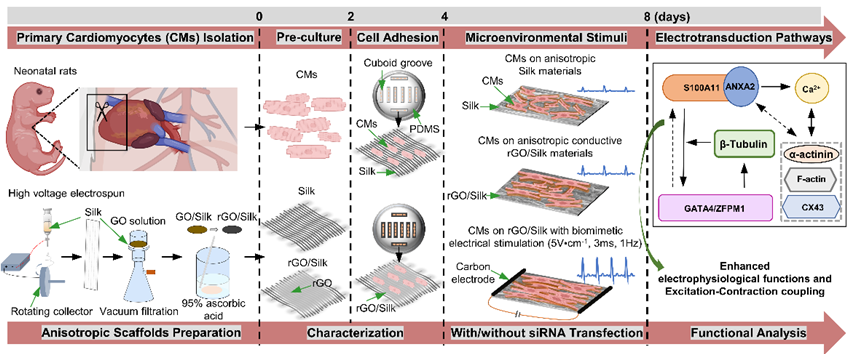 研究团队通过构建三种体外电学微环境模型,系统探讨了其对ECT中心肌细胞功能的调控机制。三种模型分别为:非导电丝素支架(Silk,模拟非导电环境)、导电还原氧化石墨烯/丝素复合支架(rGO/Silk,模拟在体导电环境),以及在rGO/Silk基础上施加节律性电刺激(rGO/Silk+ES,模拟窦房结节律性动态电学微环境)。研究结果表明,导电微环境(尤其联合电刺激)可显著上调F-actin、α-actinin及Cx43的表达,并促进基因Actn1/4表达,提示电信号促进细胞骨架装配与结构成熟。电生理方面,电学微环境显著增强钙内流、提高IMP的振幅与频率,并强化CICR过程,从而改善了细胞E−C耦联及同步搏动。导电支架与电刺激联合干预表现出协同增强效应,各项指标提升尤为显著(图1)。