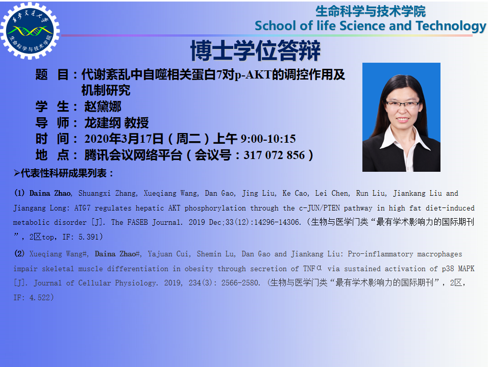 (1)DainaZhao,ShuangxiZhang,XueqiangWang, Dan Gao, Jing Liu,KeCao, Lei Chen, Run Liu,JiankangLiu andJiangangLong: ATG7 regulates hepatic AKT phosphorylation through the c-JUN/PTEN pathway in high fat diet-induced metabolic disorder [J]. The FASEB Journal. 2019 Dec;33(12):14296-14306.(生物与医学门类“最有学术影响力的国际期刊”,2区top,IF: 5.391)