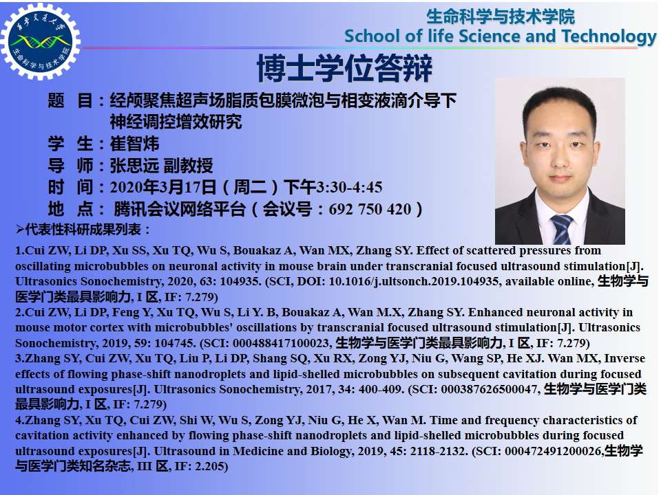 2.Cui ZW, Li DP, Feng Y, Xu TQ, Wu S, Li Y. B,BouakazA, Wan M.X, Zhang SY. Enhanced neuronal activity in mouse motor cortex withmicrobubbles' oscillations bytranscranialfocused ultrasound stimulation[J].UltrasonicsSonochemistry, 2019, 59: 104745. (SCI: 000488417100023,生物学与医学门类最具影响力, I区, IF: 7.279)