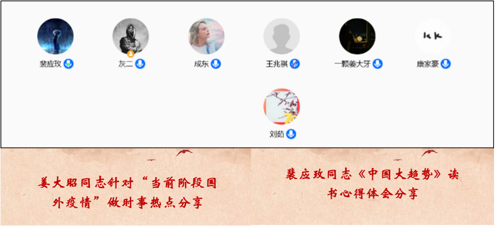在会议上姜大昭同志还就目前国际新型冠状病毒疫情的发展情况做了时事热点分享。姜大昭同志介绍了当前国际疫情的严峻形势,并表示,在当前人类命运共同体的现实性日益凸显的情况下,人类确实需要携起手来,合作应对全球公共危机。裴应玫同志进行了《中国大趋势》读书体会分享。她表示中国在创造一个崭新的社会、经济和政治模式,并已经把中国提升到了新的领导地位。这要求我们应该在这一历史洪流中奋勇向前,抓住机遇、迎接挑战,将自己的青春挥洒在实现中华民族的伟大复兴的道路上。