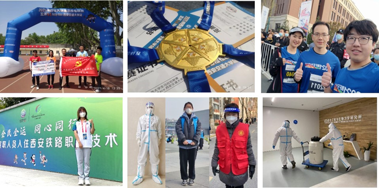 党支部传播“让年轻的我们尽情放飞梦想”理念,举办羽毛球比赛、跑步比赛等,丰富师生党员业余生活。学生积极组织、参与各类志愿者服务(TedxXian策展团队、山区支教、国际电影节字幕翻译)、体育赛事(国内外马拉松比赛、羽毛球赛、篮球赛等)、科普讲座等活动,充分发挥领导力和创造力。新冠疫情发生以来,师生们积极投身新冠肺炎防控各项任务中,为打赢抗疫阻击战贡献力量。