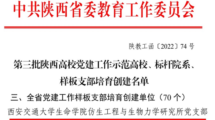 5月18日,在陕西省委教育工委公布的《中共陕西省委教育工委关于公布第三批陕西高校党建工作示范高校、标杆院系、样板支部培育创建名单的通知》中,西安交通大学生命学院仿生工程与生物力学研究所党支部(以下简称生物力学所党支部)入选“陕西省党建工作样板支部”