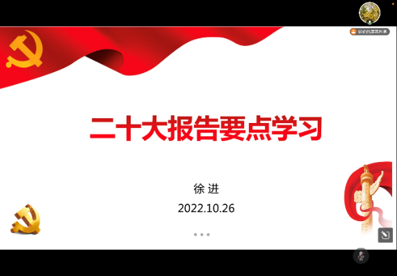 会议中徐进教授首先进行二十大报告领学,围绕党的二十大报告内容,带领党员学习。结合党的二十大报告中一个中心任务、“两步走”战略安排、三个“务必”、五个“必由之路”等关键词,帮助与会党员同志快速掌握报告要点。