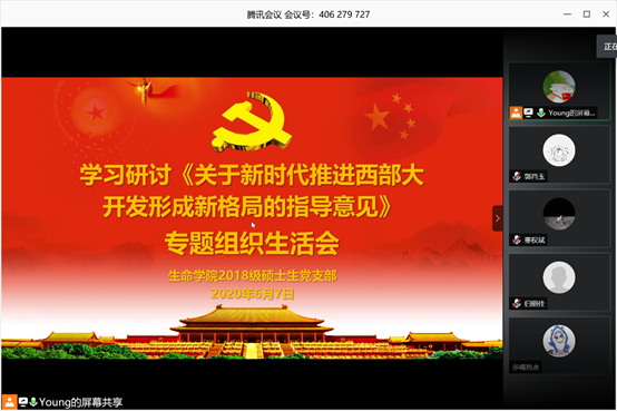 6月7日晚,2018级硕士生党支部于召开专题学习组织生活会,积极响应学校号召学习《关于新时代推进西部大开发形成新格局的指导意见》,发挥基层党支部作用为学校与西部建设发展建言献策。会议通过腾讯会议以线上方式召开,党支部书记王祥桂主持会议,全体党员和入党积极分子参加,生命学院分党委副书记李剑君列席。