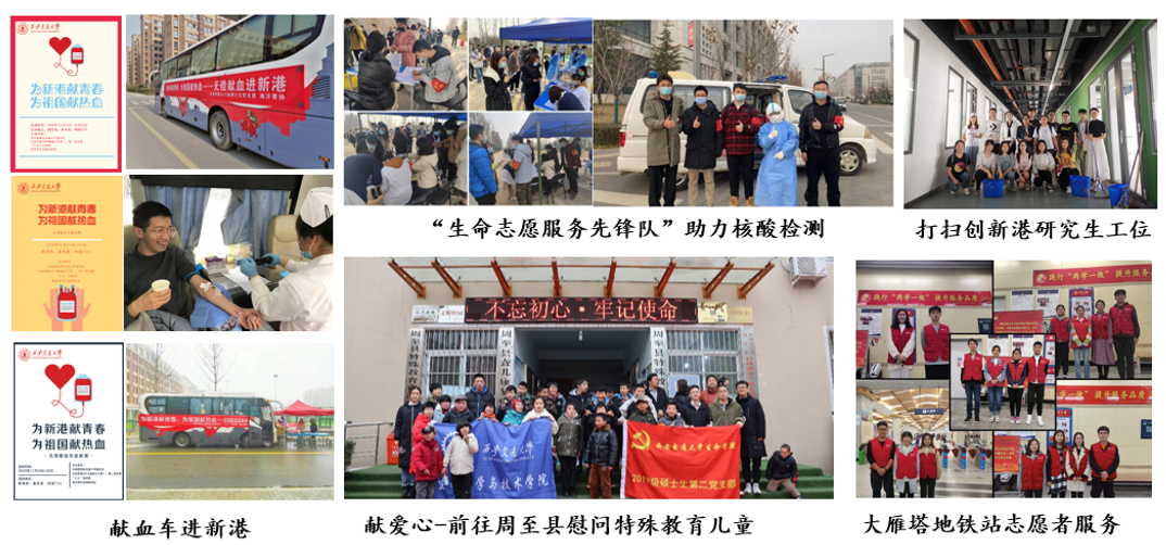 党支部成员通过实际行动践行西迁精神,共组织、参加十余次志愿活动,党支部成员志愿者工时人均超过50小时。其中,党支部策划了特色大型公益活动“为新港献青春,为祖国献热血”的献血车进创新港活动,获评西安市献血团体先进单位。在今年寒假离校之时,由党支部党员组成的“生命志愿服务先锋队”帮助医护人员在3天时间内采集了2000余名创新港学生的核酸样本,保证了创新港学子的顺利归乡。